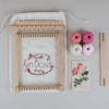Elke set wordt geleverd in een prachtige, met de hand bedrukte katoenen tas van FynBosch Design met daarin een houten frame, shuttle, kam, hevelstang, bloemenillustratie, 4 katoenen ballen en basisinstructies.